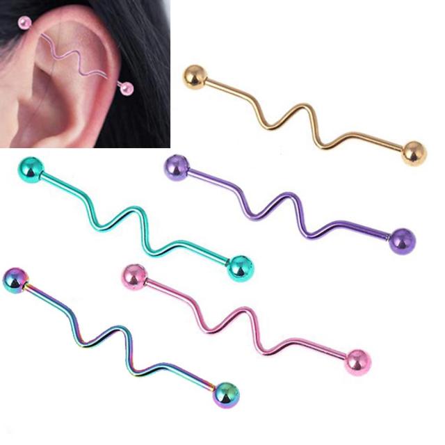紫色(パープル)とピンク色と金色(ゴールド)と虹色(レインボー)と緑色(グリーン)の5色の長いメガバーベルが緩やかに波打つ個性的なシルエットのインダストリアルバーベル。ピアスホールとピアスホールをつなげるインダストリアル用バーベルは、安心のサージカルステンレス316Lなので、ボディピアス初心者の人にもオススメのメガバーベル。ボールを手持ちのパーツに変更して使えば、アナタだけのオリジナルインダストリアルバーベルの完成!もちろんピアスホールをつなぐインダストリアルとしてだけでなく、色々な場所にも使えるボディーピアスです。ピアスホールをつなげるインダストリアルピアスは、サイズさえ合わせれば、見た目以上に簡単に楽しめるピアッシングです。メンズでもレディースでも使えるおしゃれなボディーピアスです。