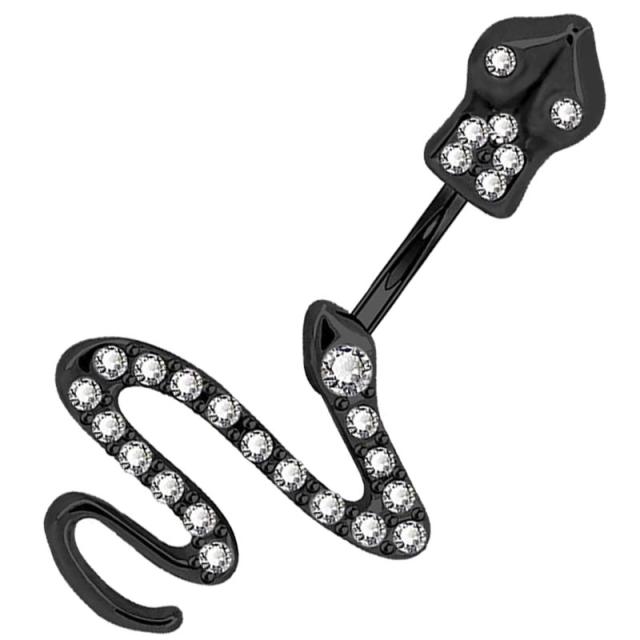 ボディピアス全身でヘビをデザインし、体にクリスタルのジルコニアをセットした黒色にブラックメッキした14ゲージのスネークへそピアス。蛇をモチーフにしたボディーピアスはメンズからもレディースからも支持率の高いボディーピアスです。全体でヘビをデザインしたバナナバーベルは注目度も満点。遊び心のある面白いデザインのカーブバーベルは蛇の頭を上にしても下にしても使えるトップダウンタイプのへそピ。