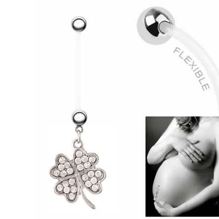 幸運の四つ葉のクローバーチャームが揺れるマタニティへそピアス。シャフト部分が長いテフロン素材で出来ているので妊娠の時に皮膚が伸びても大丈夫。また、テフロンは抗菌性も高く安心のヘソピアスです。妊娠中の人でも、ピアスホールにトラブルがある人のホールを安定させるピアスとしても使えます。妊娠のお祝いプレゼントにも使えます。出産後もそれぞれのパーツを個別に使えるので、他のボディーピアスと組み替えて使えるのも嬉しい。サーキュラーやバーベルに組み替えてヘリックスやイヤーロブに!