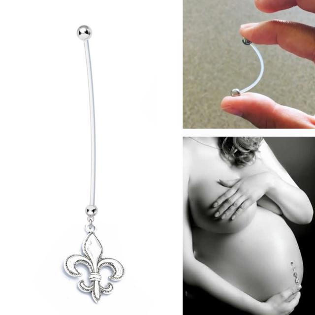 フランス王家の紋章、リリーエンブレムをデザインしたテフロンシャフトのマタニティへそピアス。妊婦用としてだけでなく、ホールのトラブルや金属アレルギーの人にもおすすめ!シャフト部分が長いテフロン素材で出来ているので妊娠の時に皮膚が伸びても大丈夫。また、テフロンは抗菌性も高く安心のヘソピアスです。妊娠中の人でも、可愛いヘソピアスをしたい!というご要望にこたえて出来た妊娠ヘソピアスは、デザインも全て赤ちゃんにまつわるデザインになっているので、妊娠のお祝いプレゼントにも使え、新しいマタニティボディピアスとしてオシャレなママに!