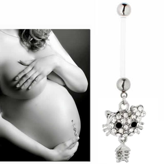 クリスタルのキュービックジルコニアを散りばめたキラキラの猫と銀色の魚の骨のチャームが揺れるテフロンシャフトのマタニティへそピアス。妊婦用としてだけでなく、ホールのトラブルや金属アレルギーの人にもおすすめ!