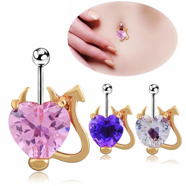 大きなハートのジルコニアにゴールドで悪魔のシッポとツノをデザインしたラブリーポップなへそピアス。ダイヤモンドのような輝きを放つ大きなハート型のジルコニアが高級感を発揮してくれるへそピアス。色もピンク、パープル、クリスタルから選べる。メンズでもレディースでも使えるへそピ。14Gなのでおへそのピアスとしてだけでなく、耳に付けても綺麗なボディーピアス。