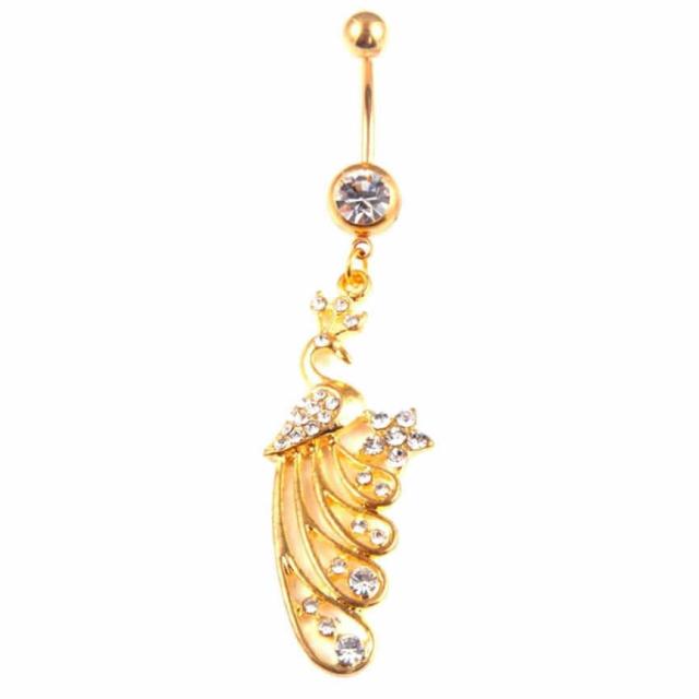 金色の孔雀をデザインしたへそピアス。ゴージャスさとセクシーさを兼ね備えたクジャクのへそピアス。縁起の良いクジャクモチーフが幅広い年齢層に人気。お臍のピアスとしてはもちろん、耳に付けてもセクシー。プレゼントにもおすすめです。