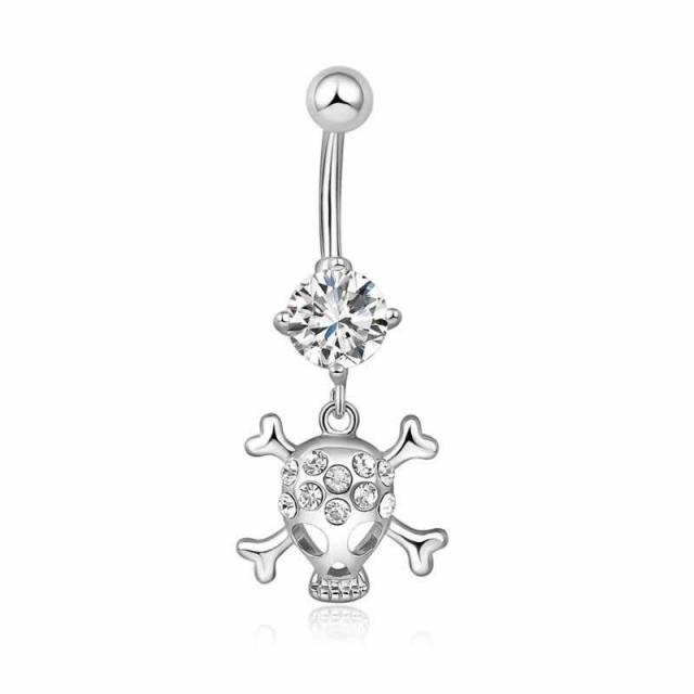 クリスタルのジルコニアをセットしたドクロのチャームが揺れるへそピアス。怖すぎない大人のスカルをデザインしたへそピアス。プレゼントにもおすすめです。オヘソのピアスとしてだけでなく、耳に付けてもOK.メンズでもレディースでも使える臍ピアスです。
