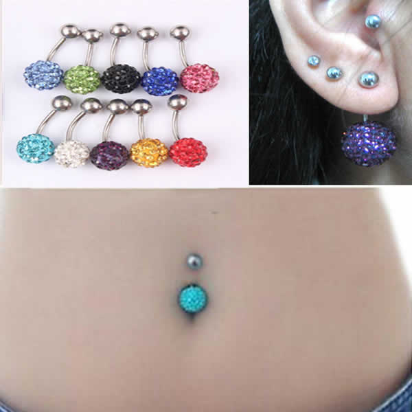 キラキラのビジューボールをセットしたへそピアス。どこの角度から見てもきれいに輝くキラキラのビジューが上品で存在感を発揮。おへそのピアスとしてだけでなく、耳などいろいろなピアッシングへ使えます。お値段も手ごろですが、ビジューをボールに直接貼っているので、強い衝撃などでジュエルが外れる恐れがあります。心配の方は、エポキシコーティング加工しているプラネタボディピアスをお勧めいたします。
