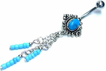 台座のセンターに大きめのターコイズが輝くネイティブ系へそピアス。インディアンジュエリーの中でも人気のターコイズと、ターコイズブルーのビーズチャームが爽やかで好感触!どんなスタイルに合うターコイズは、ペアアクセサリーにも最適!へそピアスとしてだけでなく、耳につけてもクール!カッコイイ大人のオネイさんに是非、愛用して欲しい!