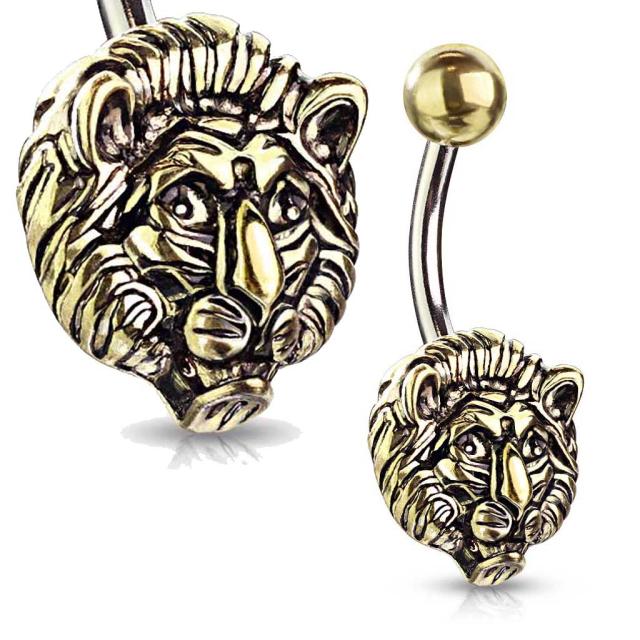 サージカルステンレス316L製のカーブバーベルにアンティークゴールドカラーの百獣の王ライオンとボールをセットした動物アニマルモチーフの個性的な臍ピアス型ボディピアス。