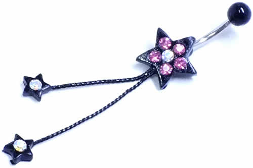ブラックの星にジュエルをセットしたロングチャームヘソピアス。長いチャームの先端にもジュエルスターをセットする事で、ポップでキュートな雰囲気に仕上がっています。ブラックにコーティングされた星は、可愛くなりすぎず、色々なスタイルにマッチしてくれるバナナバーベルです。星のモチーフはプレゼントとしても人気の高いジュエリーです。