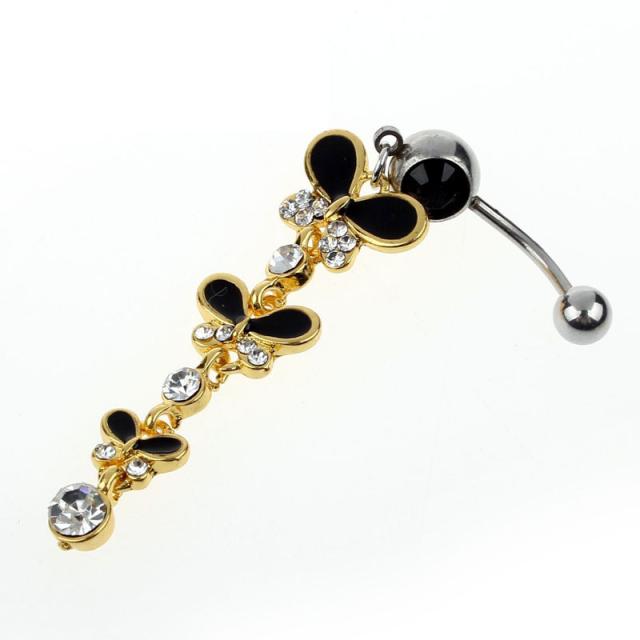ブラックのキュービックジルコニアをセットしたバナナバーベルに金色に黒のカラーとクリスタルを散りばめたチョウチョウが3匹揺れるへそピアス型ボディピアス。長く揺れるロングタイプのチャームの蝶々がセクシーに存在感をアピールしてくれるヘソピアス。ブラックとゴールドのコントラストをきかせたカラーリングは大人の女性に人気のレディースヘソピ。プレゼントにも最適。です。お臍のピアスとしてだけでなく耳に付けてもドレッシーです。