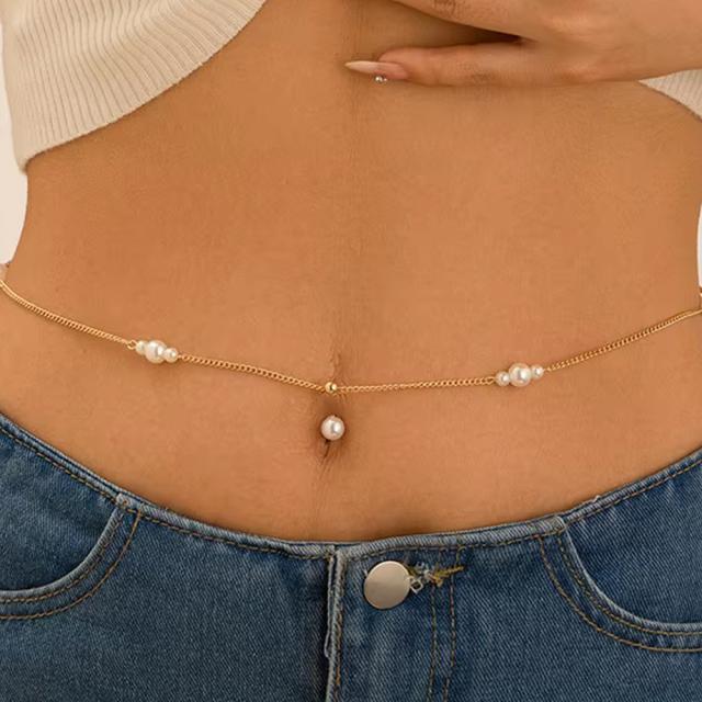 [14G ボディピアス] ゴールドパールへそピアス ウエストチェーン付き 14ゲージ ボディチェーン ビキニ 水着 鎖 臍ピアス ヘソピアス ネイブル シルバー 銀色 ベリーダンス メンズ レディース プレゼント イミテーションパール 真珠 金色 シンプル
