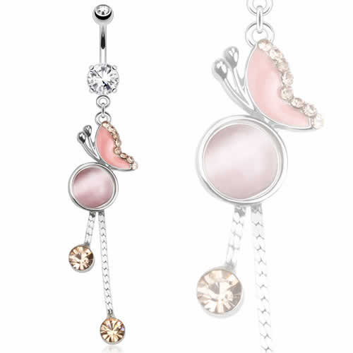 蝶々をデザインしたロングチャームへそピアス。柔らかな色合いのドレッシーチャームはスタイルを邪魔しない。おへそのピアスとしてだけじゃなく耳につけても可愛いボディピアスです。