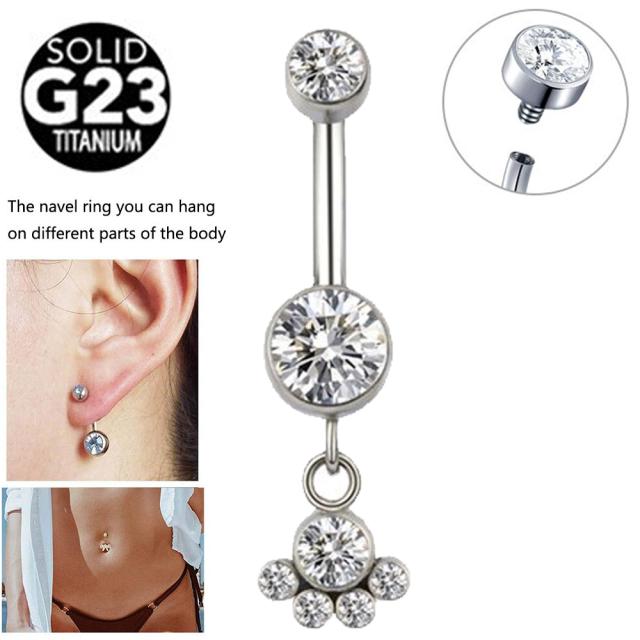 クリスタルのキュービックジルコニアをセットしたシンプルな逆ネジタイプのチタングレード23(G23)素材のカーブバーベルタイプのボディピアスに犬や猫の足跡の肉球チャームが揺れるヘソピアス。
