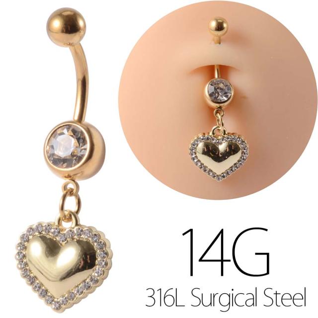 [14G カーブバーベル ボディピアス] エンジェルハートチャーム ゴールドへそピアス 14ゲージ ヘソピアス 臍ピアス メンズ レディース ボディーピアス バナナバーベル サージカルステンレス316L ジルコニア クリスタル 揺れる パヴェ ジュエル 石付き キラキラ ストーン 綺麗