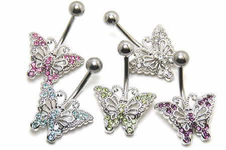 羽根に散りばめられた色鮮やかなストーンと全体に施された細やかな細工が独特の輝きを放つゴージャスな蝶のボディジュエリーです。アクセサリーの中でも人気の高い蝶々は幅広い層に人気のへそピアス。チョウチョウと花のアクセサリーをセットでつけても可愛いヘソピです。