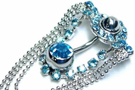 キラキラボールのチェーンチャームとジュエルチャームが揺れるシールドをセットしたヘソピアス。ゴージャス感と女らしさを両方楽しめる臍ピアスです。シールド部分だけ取り外して使えるので、手持ちの臍ピアスにつけてアレンジを楽しめちゃうへそピアスです。高級感とカジュアルさを兼ね備えたシールドタイプのへそぴは1個は押さえておきたいアクセサリーです。プレゼントとしてもきっと喜んでもらえるスタッフも一押しのへそピアスです。カラーバリエーションが豊富なのもうれしい。