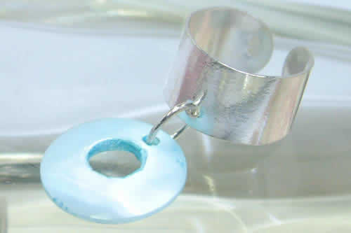 シンプルなイヤーカフに色鮮やかに染色した天然の貝のチャームが揺れる綺麗なシルエットのアクセサリー。