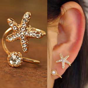 ダブルアールイヤーカフ(スター) 星 ヒトデ スターフィッシュ 1個販売 イヤリング イヤークリップ フェイクピアス 耳 軟骨 レディース ゴールド 金色 シルバー 銀色 ラインストーン はさむ キラキラ クリスタル ノンホールピアス ノンホールイヤリング あけない 海星