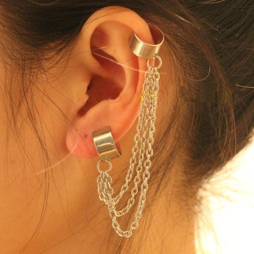 シンプルなイヤーカフを3本の長さの異なるチェーンでつなげたパンクなイヤーカフ。