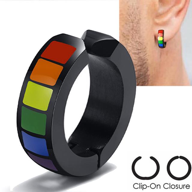 黒色のサージカルステンレス316L製のフープピアスに、赤色レッド、オレンジ色、黄色イエロー、緑色グリーン、青色ブルー、紫色パープルにエナメルコーティングしたカラフルなサージカルステンレス316L製のイヤーカフ。奇抜な色合いと虹のようなレインボーカラーが存在感を発揮してくれるブラックイヤリングは男性からも女性からも人気。