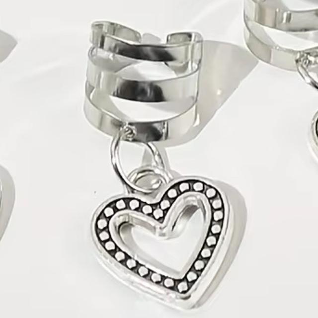 銀色のカフとハートのチャームが揺れるデザインが魅力的なアイテムです。穴を開けずに耳に挟むだけで装着できるので、ピアスホールがない方にもぴったり。シルバーの輝きが耳元を華やかに演出し、メンズ・レディース問わず使えるユニセックスなデザインです。真鍮製で激安価格なので、最近では耳に挟むだけでなく、ダンス発表会やコンサートの時、ドレッドヘアーや編み込みの髪にはさんでヘアアクセサリーとしてもつかわれる流行のアクセサリーです。