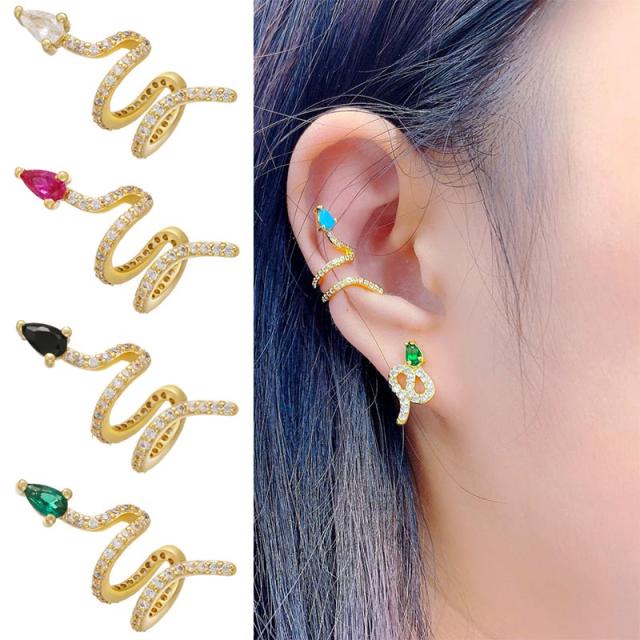 ゴールドメッキしたキラキラのクリスタルをセットした蛇のイヤーカフにの頭にカラフルなジュエルストーンをセットしたおしゃれで綺麗なノンホールピアス。