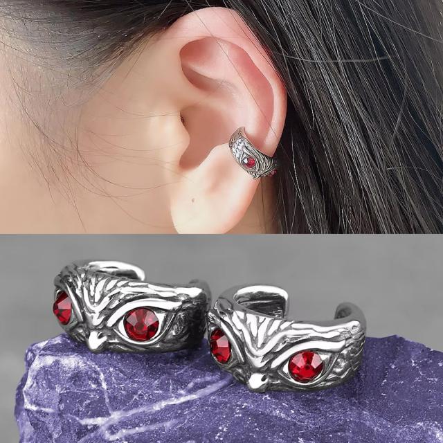 ジュエルアイオウルステンレスイヤーカフ(レッド) 1個販売 梟 ふくろう ジルコニア 赤色 ストーン 石付き 目 眼 かっこいい メンズ レディース イヤリング 挟む はさむ ノンホールピアス イヤカフ イヤークリップ フェイクピアス 彼氏 彼女 プレゼント