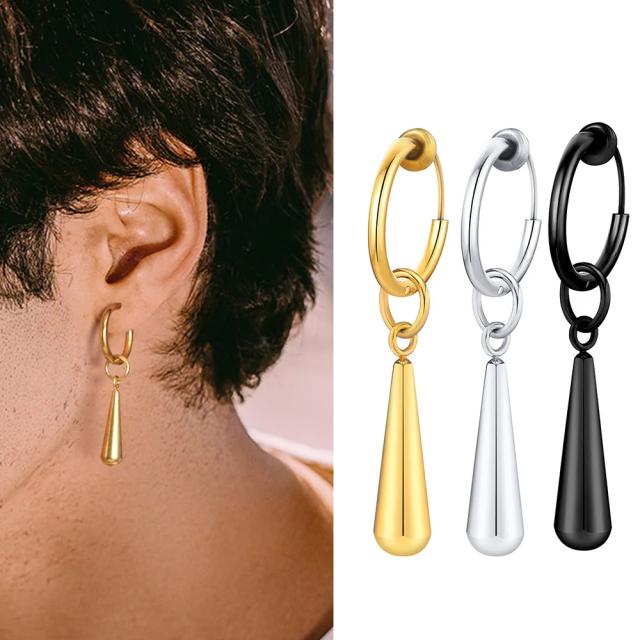シンプルなフープタイプのイヤリングに大きめの涙のようなティアードロップ型のチャームが揺れる存在感のあるステンレス製のノンホールピアス。
