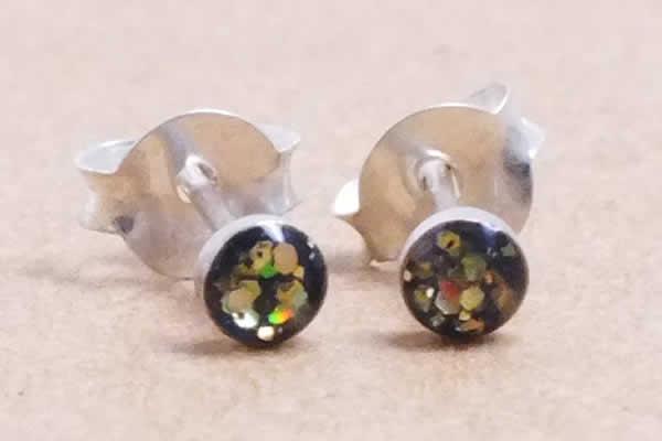 グリーンのラメ入りスタッドピアスです。装着すると耳元でキラキラ光ります。表面を樹脂コーティングしているので光をうけてさらにキラキラしまくりです。