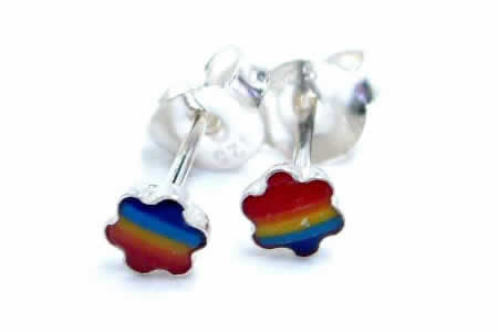 花形のフレームの中に虹を閉じ込めた綺麗なスタッドピアス。小振りながら色鮮やかな色彩と可愛いお花のフォルムが女の子をトリコにさせるシルバーピアスです。大きすぎないデザインのピアスは他のピアスと合わせてもコーディネートできるし、手頃な価格なので、友達にプレゼントも!