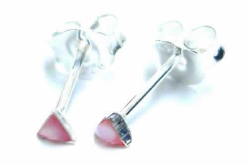 三角形の小さな台座にカラフルな練り石をセットしたスタッドピアス。どんなスタイルにも合わせやすいシンプルさが人気の秘密。男女を問わず装着できるのでペアで愛用するのもオススメ。控えめなサイズなので、さりげなくアピールしたり、重ね付けしたり、使い方も自由自在のシルバーピアス。サイズ違いも豊富にそろうので、合わせてコーデしてもGOOD!ファーストピアスに使ってもいいよ。
