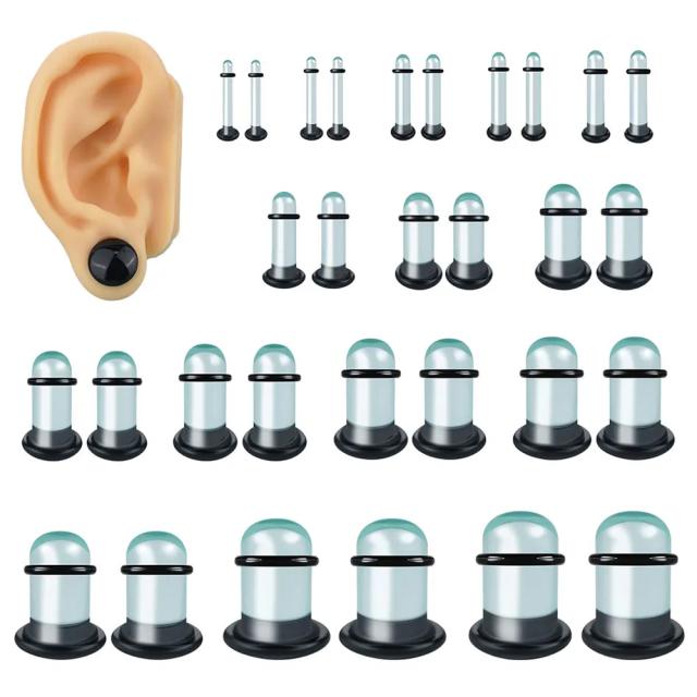 清潔感のあるブラックと透明のガラスに黒色のシリコンゴムキャッチをセットしたシンプルな形状のボディーピアスは、男性からも女性からも人気。ガラス製なので、金属アレルギーもなく金属アレルギー対応で洗えるので清潔さも保てます。 片側がフラットで、片側が丸みのあるシングルフレアや弾丸のバレットのような形状なので、装着もしやすく、見た目もすっきり。