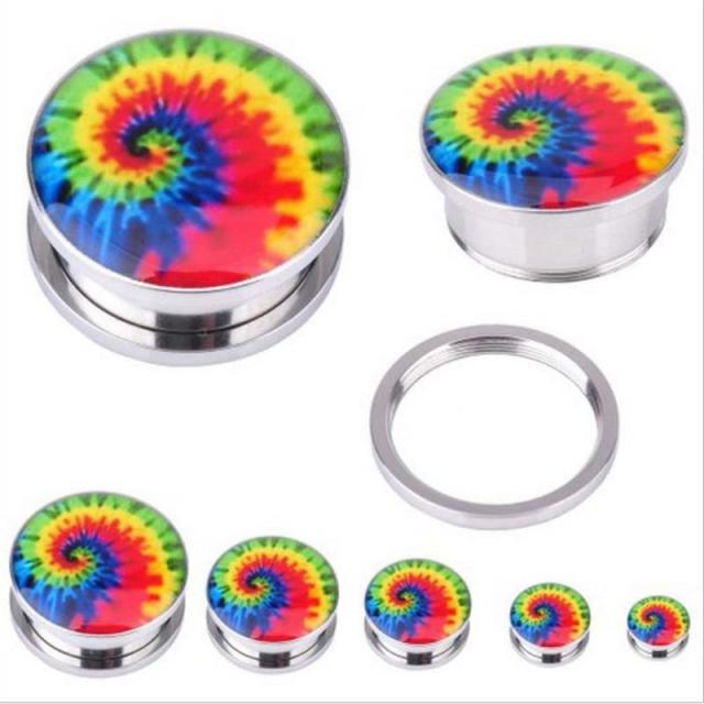 ステンレス製のネジタイプのトンネルにタイダイ染したような虹色の渦をデザインしたレゲエ好きにはマストなトンネル型ボディピアス。ネジで外せる土管型のトンネル型ボディーピアスなので、装着も簡単で、ホールも大きく見せる。存在感のあるタイダイのデザインはメンズでもレディースでも使えるかっこいいデザイン。ペアルックで愛用するのもおすすめのホール系ボディーピアス。激安価格もうれしいボディピアス。プレゼントにも最適です。ディーピアス。激安価格もうれしいボディピアス。