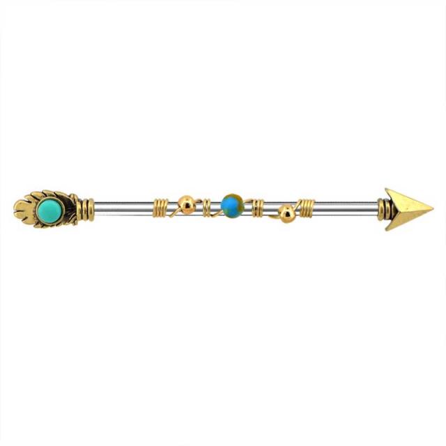 ステンレス製のシャフトが真っ直ぐの長いロングバーベルに羽根飾りをつけた矢と真ん中にはトルコ石ビーズをセットしたまるでインディアンの矢じりをイメージさせるおしゃれなインダストリアル用ボディーピアス。