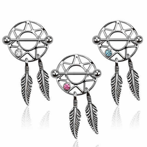 [ 14G ニップル 乳首 ] ドリームキャッチャーニップルピアス ストレートバーベル シールド 14ゲージ 胸 乳輪 ボディピアス メンズ レディース サージカルステンレス316L ボディーピアス ラインストーン インディアンジュエリー ボヘミアン フェザー 羽 別売り16Gに変更可能