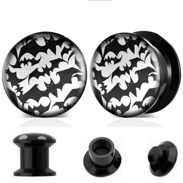 ダブルフレアの黒のアクリルプラグに吸血コウモリをデザインしたネジタイプのボディピアス。