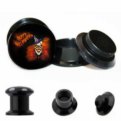 ダブルフレアの黒のアクリルプラグにサーカスのピエロをデザインした不気味なボディピアス。ハロウィンパーティーのコスプレにもオススメ!ネジ式のフレアなので、装着も簡単。メンズでもレディースでも使えるボディピアスです。コスパにも注目!アクリル製なので金属アレルギーの心配もない。