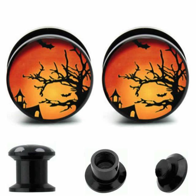 ダブルフレアの黒のアクリルプラグに廃墟をデザインした不気味なボディピアス。ハロウィンパーティーのコスプレにもオススメ!ネジ式のフレアなので、装着も簡単。メンズでもレディースでも使えるボディピアスです。コスパにも注目!アクリル製なので金属アレルギーの心配もない。