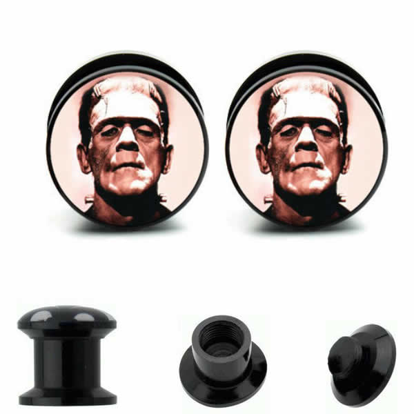 ダブルフレアの黒のアクリルプラグにフランケンシュタインをデザインした不気味なボディピアス。コスプレにもオススメ!ネジ式のフレアなので、装着も簡単。メンズでもレディースでも使えるボディピアスです。コスパにも注目!アクリル製なので金属アレルギーの心配もない。