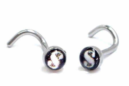 黒のキャンパスに白地でドルマークをデザインしたパンクな鼻ピアスです。黒と白のコントラストをきかせたデザインが、インパクト大。シンプルキレイなデザインがカッコイイ系の貴方にピッタリ!