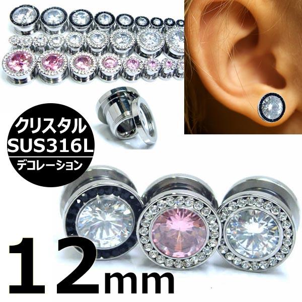 [ 12mm ジルコニア ボディピアス ] デコレーション トンネル 12ミリ 12.0mm サージカルステンレス316L ブラック ピンク クリスタル キュービックジルコニア キラキラ 高級 メンズ レディース ペア パヴェ パベ ネジ式 ネジタイプ デコ プラグ 埋め込み型 拡張 ハーフインチ