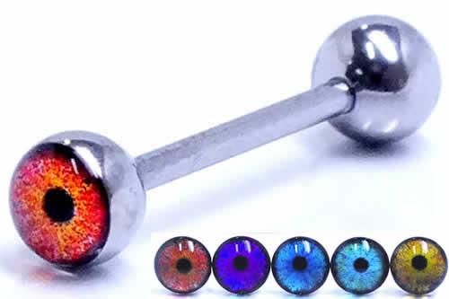 不気味な目をデザインしたボールをセットしたバーベル型のボディピアス。色や大きさも選べて、ステンレスピアスも揃う人気のデザイン。不気味な目力に威圧されそう。バーベルタイプは両側ネジタイプなので、装着も簡単で、内径サイズも豊富に揃うので、イヤーロブやヘリックス、ニップルなどなどいろいろな場所のピアッシングに使えます。ネジボールを組み替えて、色々なボディーピアスに使っても面白い。