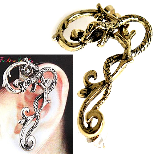 アンテークゴールド色と白銀色にメッキされたイバラと蛇をデザインしたイヤーラップピアス。耳を覆い隠すほどの大きさの蛇のイヤーラップが存在感を発揮してくれる。装着方法は、カーフを耳の横につけ、ピアスを耳たぶに装着する。耳の形や大きさに合わせて形を調整してください。この存在感でこの価格はかなりお手ごろ!