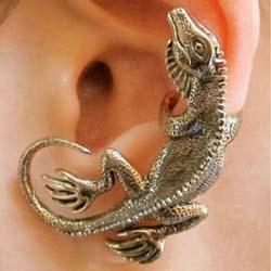 オオトカゲをデザインしたアンティークゴールド色やシルバー色のイヤーカフピアス。耳半分を覆い隠すような大きなオオトカゲが存在感を発揮してくれるイヤーラップピアスです。耳たぶにピアスを装着してオオトカゲの腕で耳を挟んでください。左耳用のイヤーラップピアスです。