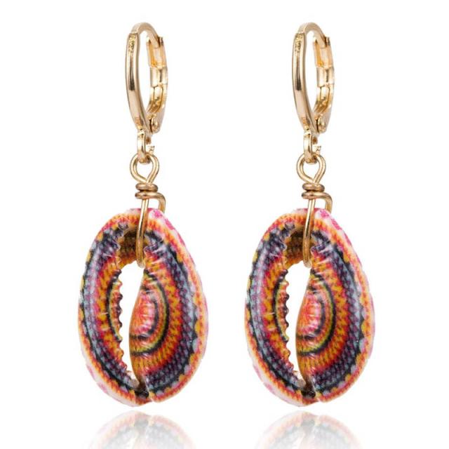 金色のシンプルなリングピアスに天然の貝殻にタイダイ模様の柄をデザインしたチャームが揺れるゴールドリングピアス。