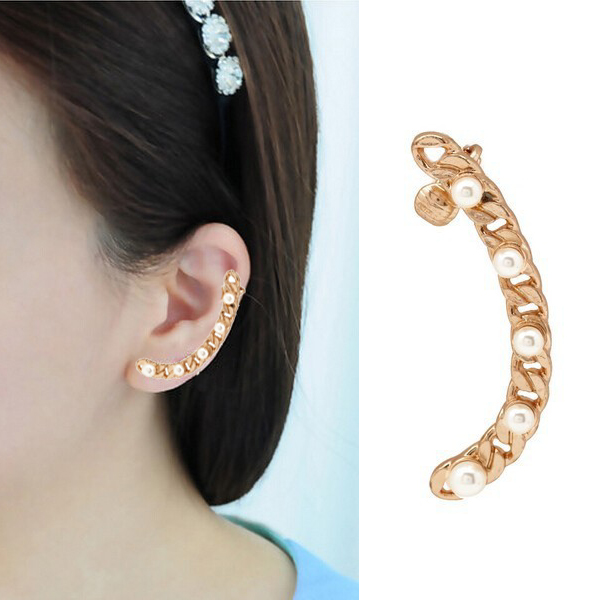 喜平チェーンにイミテーションパールをセットしたレディライクなイヤーラップピアス。