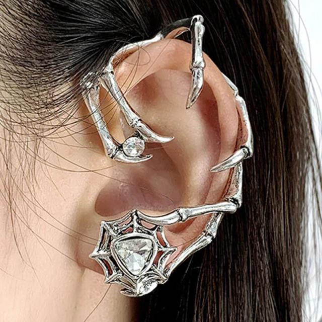 シルバー色に銀メッキした悪魔の爪とクモの巣をモチーフにしたデザインに三角形のキュービックジルコニアをセットした不気味なイヤーラップピアス。
