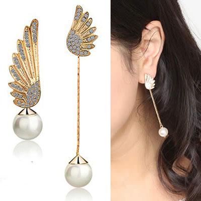 天使の翼に大きなパールのチャームが付いたドレッシーなピアス。片側は論議具チャームになったアシンメトリーなデザインがおしゃれ。