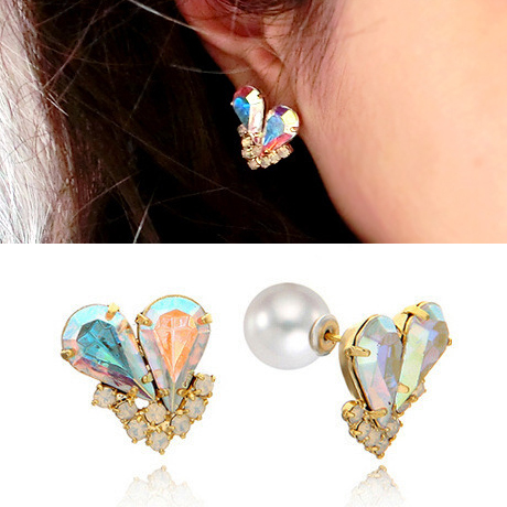 オーロラに輝くキラキラのビジューハートに人気のパールキャッチをセットしたバックキャッチピアス!