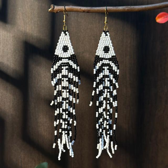 カラフルビーズボヘミアンファッションピアス(フィッシュボーン) 1ペア 20G 20ゲージ 20g ホワイト ブラック 黒色 白色 魚 サカナ 骨 ハロウイーン 仮装 メンズ レディース ジェンダーレス 手作り フックピアス インディアンジュエリー 大きい 長い プレゼント ギフト