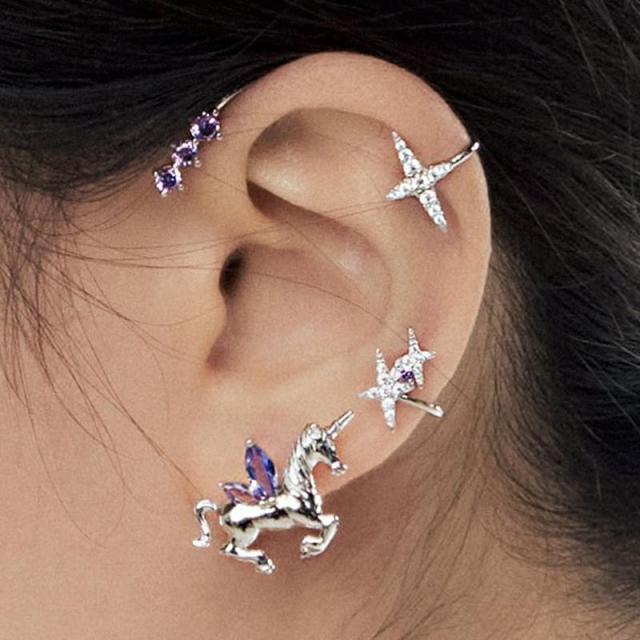 キラキラユニコーンイヤーフック 1個 左耳用 右耳用 クリスタル パープル 星 スター ペガサス 一角獣 ジルコニア イヤーカフ イヤリング メンズ レディース 耳にかける イヤーラップ 開けない ピアスホール不要 ノンホールピアス 男子 女子人気 プレゼント ギフト